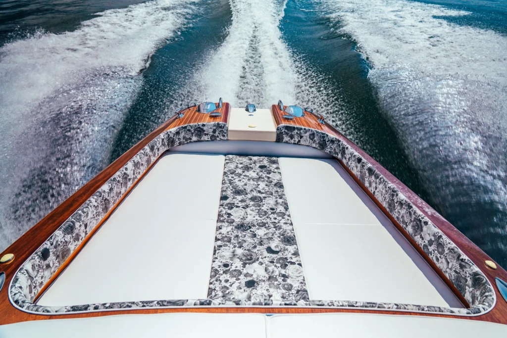 It features mahogany decking for the exterior and ‘Summer’ upholstery by Casalta for the interior.
